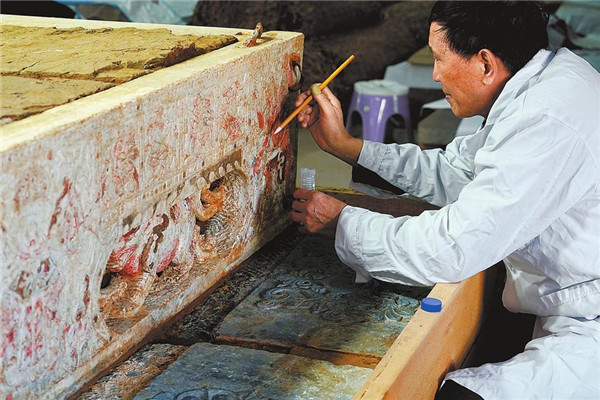 工作人員在對(duì)石棺床的彩繪進(jìn)行加固。