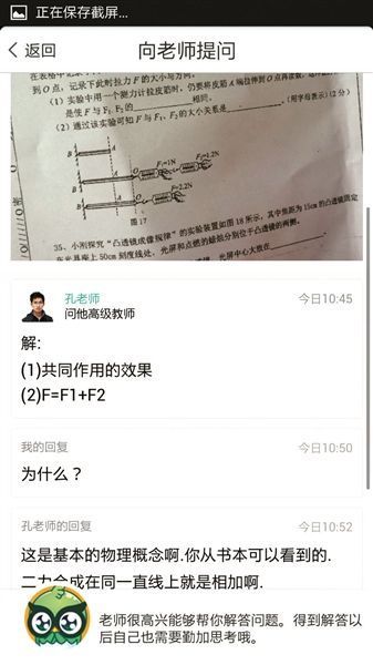 一款較為火爆的解題神器——“問(wèn)他作業(yè)”,進(jìn)入應(yīng)用主頁(yè)后,頁(yè)面上顯示“我要提問(wèn)”的指示圖標(biāo),點(diǎn)擊進(jìn)入后,有兩個(gè)“提問(wèn)方式”供選擇,一為“向?qū)W霸提問(wèn)”,二為“向老師提問(wèn)”,記者點(diǎn)選了“向老師提問(wèn)”,上面注明需“付費(fèi)”,記者注冊(cè)并充值后進(jìn)入正式提問(wèn)頁(yè)面,需填寫(xiě)“選擇年級(jí)和學(xué)科”后,“上傳圖片或輸入問(wèn)題”。記者隨機(jī)拍了一道初二物理“力學(xué)”試題上傳,5分鐘后一位標(biāo)注為“問(wèn)他高級(jí)教師”的孔老師給了答案,答案中沒(méi)有任何解析說(shuō)明。記者隨后點(diǎn)了回復(fù),提問(wèn)“為什么?”孔老師2分鐘后回復(fù),“這是基本的物理概念啊,你從書(shū)本可以看到的,二力合成在同一直線上就是相加啊!闭麄(gè)解題結(jié)束后,系統(tǒng)提醒“是否采納答案”,點(diǎn)擊“采納”后,扣除了2個(gè)問(wèn)豆,即2塊錢(qián)。