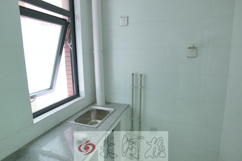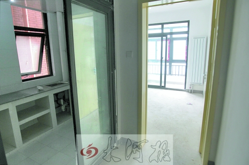 在這棟樓的21樓,工作人員隨便打開一個房間,是套兩室一廳,48平方米,衛(wèi)生間、臥室、廚房一應(yīng)俱全。廚房有操作臺、水龍頭;臥室有暖氣片;衛(wèi)生間還裝有坐便、梳洗池、墻上貼有瓷磚,還有吊頂、燈。臥室有一個小陽臺。