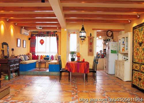 客廳與餐廳貫通,暖色的墻壁配以冷色的石板地磚,舊式的家具風(fēng)格卻以現(xiàn)代的手法裝飾。