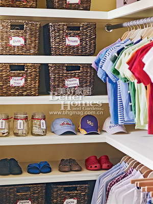 一些特殊的衣服,比如襪子、健身服、睡衣褲等不方便疊起來放置,最好的辦法是在衣櫥里準(zhǔn)備上幾個貼有標(biāo)簽的收納籃,將這些特殊衣物分類放進(jìn)筐里。