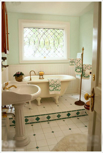 早在八九十年代,地磚剛剛普及的時(shí)候,顏色、款式、花紋、形狀,這些都是不曾去想的,一塊白乎乎像饅頭又冰涼涼像冰棍的磚頭,早就讓大家心馳神往了。在這幅圖里,經(jīng)典白瓷磚再現(xiàn),搭配星星點(diǎn)點(diǎn)的綠色小方塊瓷磚,復(fù)古,典雅,清新。加上立式羅馬柱洗手臺(tái),高腳浴缸,都有種老歐洲的風(fēng)情呢。除卻美觀不說(shuō),摩擦面積增大了,防滑效果杠杠的。