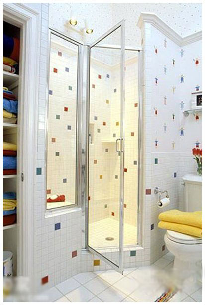 同樣是最簡(jiǎn)潔的基本款白瓷磚,上圖的搭配營(yíng)造出了典雅范兒,那么這款則充滿了俏皮活潑的感覺(jué)。一種白瓷磚,三種色彩搭配,細(xì)致設(shè)計(jì),對(duì)抗滑鐵盧哦!第一、地面馬桶周遭,將瓷磚切割成小長(zhǎng)條,多種顏色混搭,拼出一塊隔離防滑帶。第二、浴室外部做了墻裙設(shè)計(jì),墻裙以上部分,是彩色小人壁紙。第三、淋浴室內(nèi)部,隨意鑲嵌的彩色小方塊,不同于白色瓷磚的質(zhì)感。