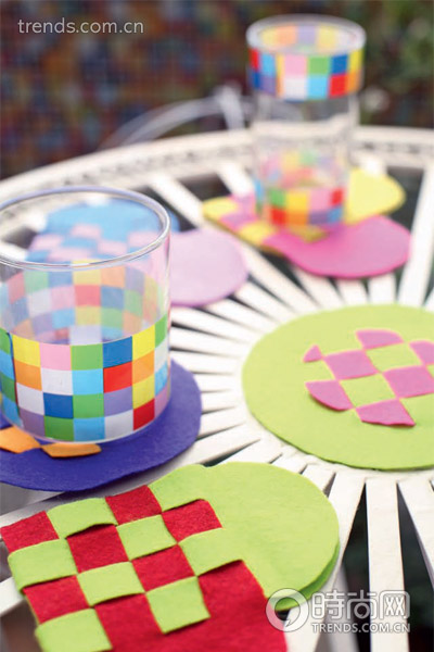 不織布制作格子的杯墊軟硬度正合適,從格子的編織難易度來說也很方便。采用多種色彩的不織布,編織出不同形狀和風(fēng)格的杯墊,令用餐的心情也很愉快。