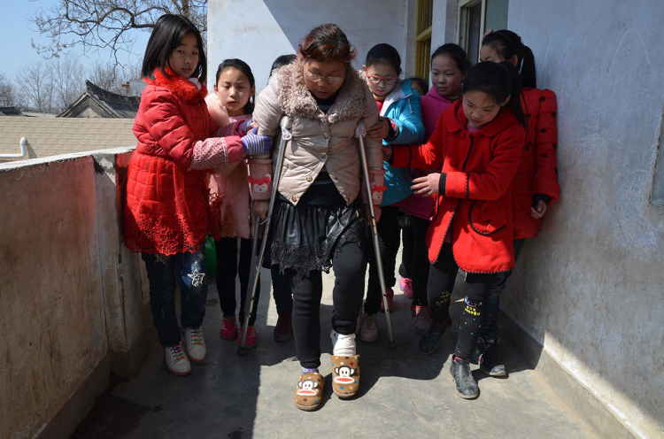 薛老師的左腿打了夾板,下垂時(shí)間長(zhǎng)了會(huì)腫脹,所以她一上課,學(xué)生們就給她搬來(lái)一個(gè)凳子,把受傷的腿支起來(lái)。需要板書的時(shí)候,她就蜷起傷腿,靠一條腿撐地。