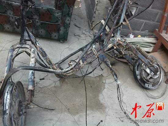 上午9時許,記者來到中原路京廣路時,自燃的電動車正放在路邊一間修車行里,被燒得精光,只剩一副鐵架子。