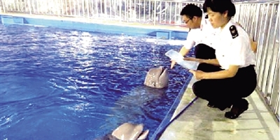 河南檢驗檢疫局工作人員在對白鯨進行檢疫監(jiān)管