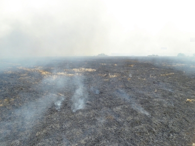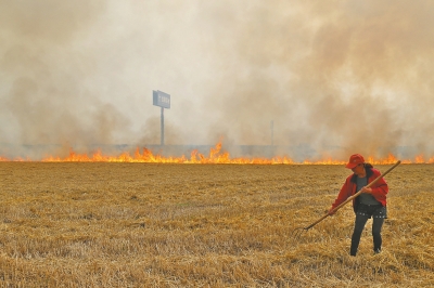 一個多小時后,本報(bào)記者趕到現(xiàn)場,見到京港澳高速公路淮河大橋北岸的路東側(cè)麥茬地里,因過火已出現(xiàn)大片的“黑地圖”。沒過火的地塊里,村民們正在用木桿鐵叉,抖撒收割機(jī)收割粉碎還田的秸稈,使其蓬松在麥茬上以便燃燒;遠(yuǎn)處幾塊麥茬地的地頭處,幾名村民還在不停地放火。