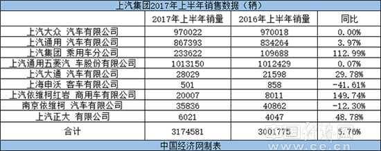 央廣網河南分網消息 隨著上海汽車集團股份有限公司(以下簡稱“上汽集團”)近期公布了其2017年6月份產銷快報,上汽集團上半年銷售數據也隨之出爐:2017年上半年,上汽集團銷售汽車3174581輛,同比增長5.76%。