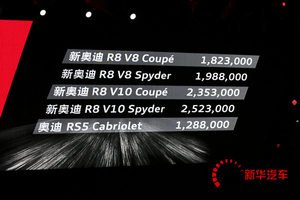 央廣網(wǎng)河南分網(wǎng)消息 據(jù)新華汽車報(bào)道:2013年10月24日,奧迪官方正式宣布新款?yuàn)W迪R8 Coupe、spyder以及奧迪RS 5 Cabriolet敞篷版車型正式上市。此次上市的新車進(jìn)一步完善了奧迪高性能車型的產(chǎn)品陣容。其中新款?yuàn)W迪R8共有V8 Coupe、V8 spyder、V10 Coupe以及V10 Spyder 4款車型,奧迪RS 5 Cabriolet敞篷版僅有一款車型。詳細(xì)車型售價(jià)如下: