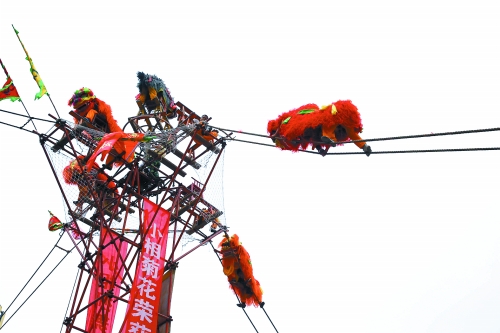 十幾米的高臺,四周用繩子牽引,獅子就利用繩子爬上高臺。隨著上面“板叉”“頭扛尾”“倒立”等驚險表演,臺下不時發(fā)出驚呼聲,孩子們都看得目不轉(zhuǎn)睛,許多人拿著手機拍照,附近居民樓上許多人從窗戶里探身往外看。