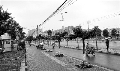 中廣網河南分網消息 據鄭州晚報報道:12日下午,正下著小雨。在豐慶路與國基路交叉口向南約100米路西人行道上,8棵大葉女貞樹像8把撐開的雨傘,兩米以上的樹枝全部被砍掉。