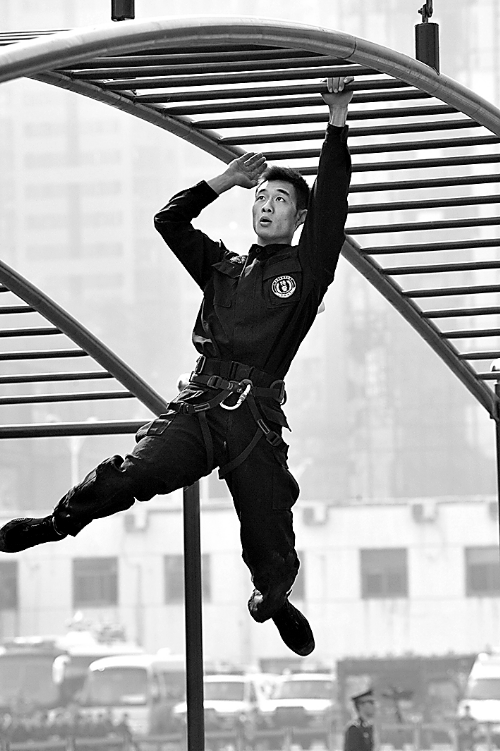 10月18日至19日,來自河南、江西、湖南和湖北的4支公安特警隊(duì)72名精英隊(duì)員在鄭州進(jìn)行大比武。(劉書亭 攝)