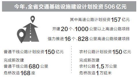 今年,全省交通基礎設施建設計劃投資506億元,其中高速公路計劃投資157億元。強力推進16個、828公里高速公路續(xù)建項目。普通干線公路計劃投資150億元,重點實施低等級公路升級改造、城鎮(zhèn)過境段建設,完成新改建普通干線公路680公里,危橋改造168座;農村公路計劃投資150億元,完成新改建農村公路1.5萬公里,危橋改造1萬延米。(記者 董娉)