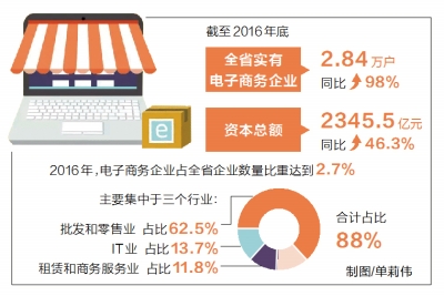 2016年,電子商務企業(yè)占全省企業(yè)數(shù)量比重達到2.7%,較上年同期提升1個百分點。全省電子商務企業(yè)主要集中于批發(fā)和零售業(yè)、IT業(yè)、租賃和商務服務業(yè)三個行業(yè),占比分別為62.5%、13.7%和11.8%,合計占比88%。
