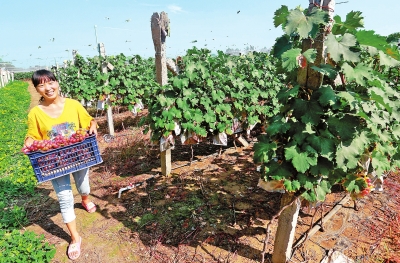 圖為在郟縣長(zhǎng)橋鎮(zhèn)確李村“神農(nóng)夫葡萄莊園”,返鄉(xiāng)創(chuàng)業(yè)青年李艷娟正在果園里采摘葡萄,豐收的喜悅使她笑逐顏開(kāi)。