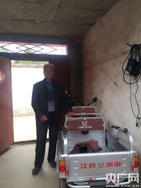 脫貧戶高大爺站在新買的三輪車前喜笑顏開