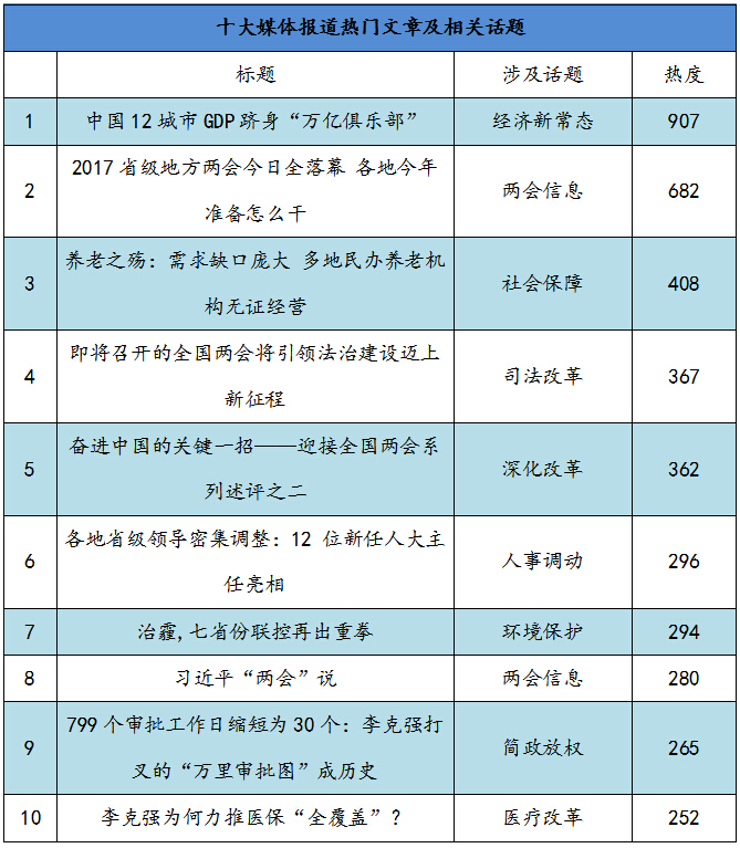 (二)近一周兩會媒體報道熱點文章及話題排行