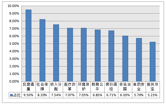 中青輿情監(jiān)測室針對2017年網(wǎng)民最關(guān)心的兩會熱點話題進(jìn)行統(tǒng)計分析發(fā)現(xiàn),反腐倡廉問題依舊備受關(guān)注,不少網(wǎng)民表示近年來中央出重拳強(qiáng)力反腐,成績顯著,讓網(wǎng)民對反腐倡廉工作有了更大的期待,更有不少網(wǎng)民希望反腐勢頭要加緊轉(zhuǎn)向“打蒼蠅”,讓清正之風(fēng)吹得更廣。而在社會保障層面,就業(yè)、養(yǎng)老、醫(yī)保社保等民生問題,網(wǎng)民表示仍有待跟進(jìn)及完善。在過去的一年,明星片酬過高一度成為輿論較為關(guān)注的話題,在今年的兩會熱點話題中,收入分配問題受到廣泛關(guān)注,其中針對明星收入過高、教職工收入偏低,公務(wù)員待遇不高等諸多問題被高頻提及。此外,醫(yī)藥體制改革、環(huán)境保護(hù)、教育公平、房價調(diào)控、依法治國、食藥安全、脫貧攻堅等均是網(wǎng)民的關(guān)注重點。