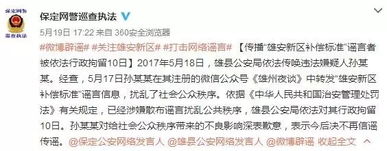 真相:所謂的“補(bǔ)償標(biāo)準(zhǔn)”是一則不折不扣的謠言。此前,河北雄安新區(qū)臨時(shí)黨委、籌委會(huì)發(fā)布題為《堅(jiān)持“以人民為中心”的理念認(rèn)真制定好土地征遷政策》的明白紙。明白紙?zhí)岢,目前,新區(qū)土地征遷工作正處于調(diào)查摸底、征求意見(jiàn)階段,新區(qū)籌委會(huì)尚未以任何形式發(fā)布過(guò)任何內(nèi)容的“征遷標(biāo)準(zhǔn)”。5月20日,雄縣公安局依法對(duì)涉嫌傳播“雄安新區(qū)補(bǔ)償標(biāo)準(zhǔn)”謠言信息的孫某某做出行政拘留10日的處罰決定。