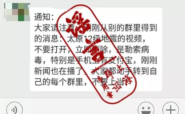 5月中旬,一則“‘太原12級(jí)地震視頻’帶有勒索病毒”的消息在微信群中大肆傳播:“大家請(qǐng)注意,剛剛從別的群里得到的消息:太原12級(jí)地震的視頻,不要打開(kāi),立即刪除,是勒索病毒,特別是手機(jī)上有支付寶的。剛剛新聞也在播了,大家都動(dòng)手轉(zhuǎn)到自己的每個(gè)群里,不要上當(dāng)!
