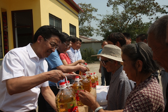 圖片說(shuō)明:2016年9月10日河南省人民醫(yī)院院長(zhǎng)顧建欽(左一)、黨委書記邵鳳民(左二)帶領(lǐng)醫(yī)院領(lǐng)導(dǎo)班子成員到高白玉村調(diào)研指導(dǎo)駐村扶貧工作的同時(shí),慰問(wèn)村內(nèi)特殊群體