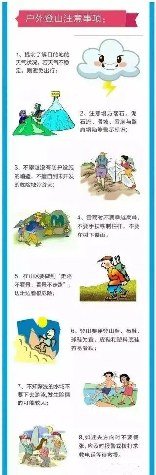 同時(shí),泌陽蛟龍應(yīng)急救援隊(duì)向網(wǎng)友發(fā)布戶外登山注意事項(xiàng):