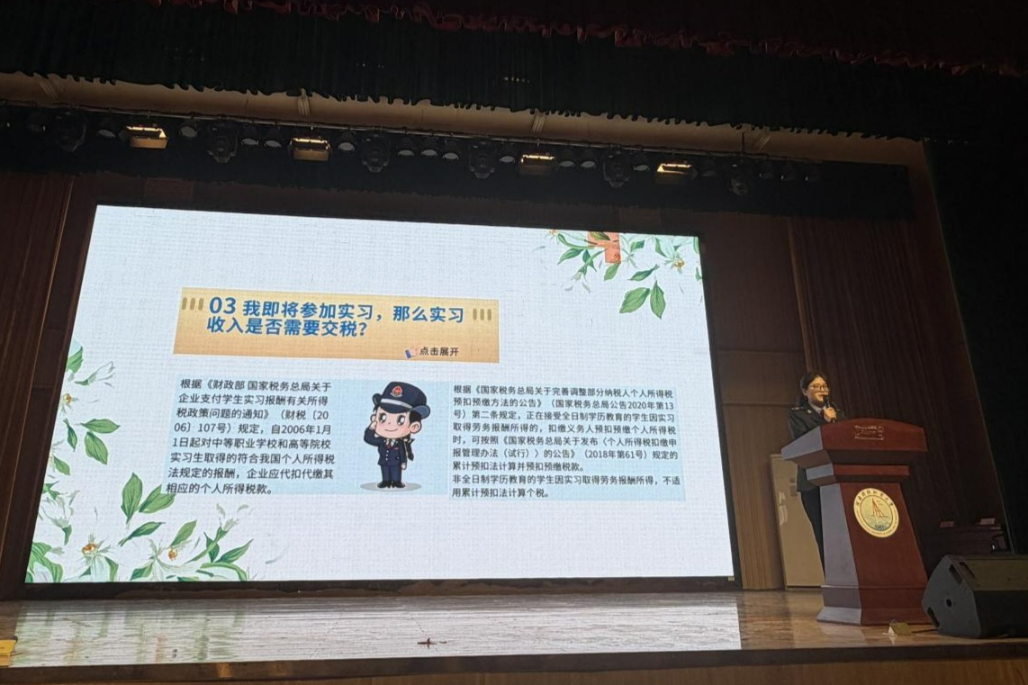 辯論賽后,稅務(wù)干部開展稅法講堂,聚焦大學(xué)生創(chuàng)業(yè)就業(yè)需求,講解個人所得稅專項附加扣除、創(chuàng)業(yè)稅收優(yōu)惠、企業(yè)涉稅規(guī)范等實用知識,用真實案例為學(xué)子送上“稅務(wù)攻略”。