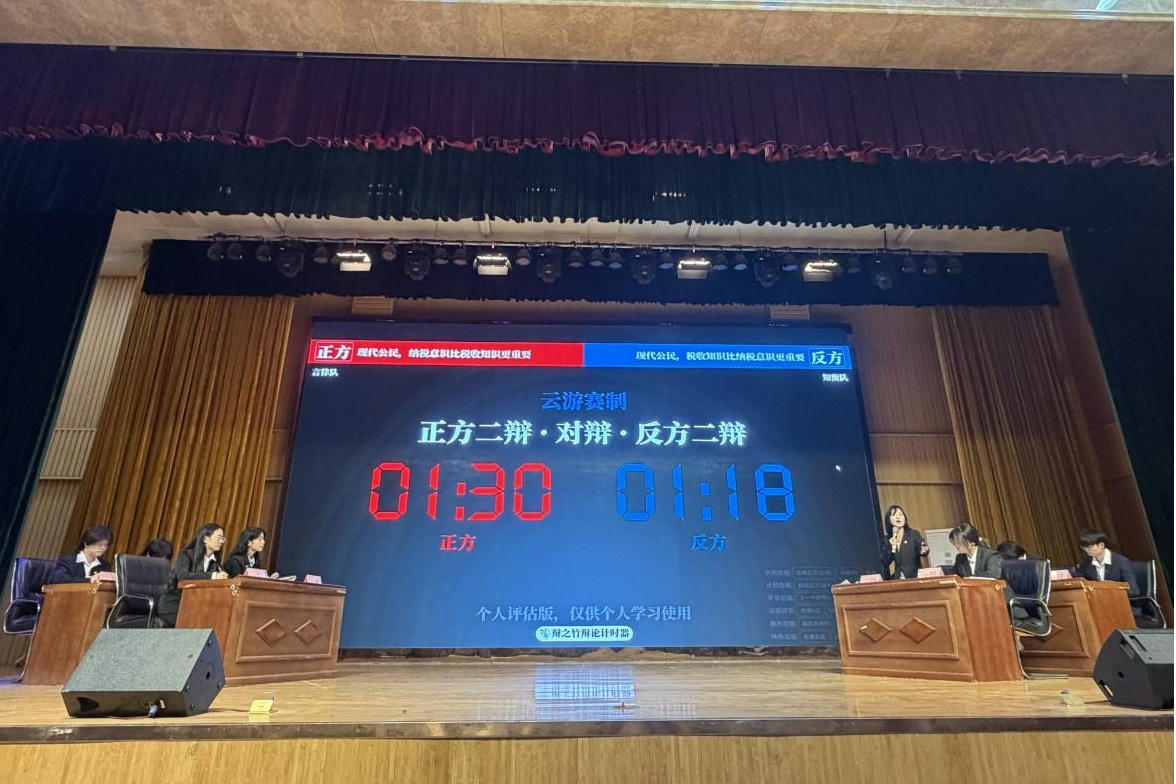 辯論賽圍繞“現(xiàn)代公民,納稅意識與稅收知識孰更重要”展開。正反雙方辯手從稅收本質(zhì)、公民責(zé)任、社會價值等角度激烈交鋒,幫助在場觀眾理解稅收“取之于民、用之于民”的內(nèi)涵。