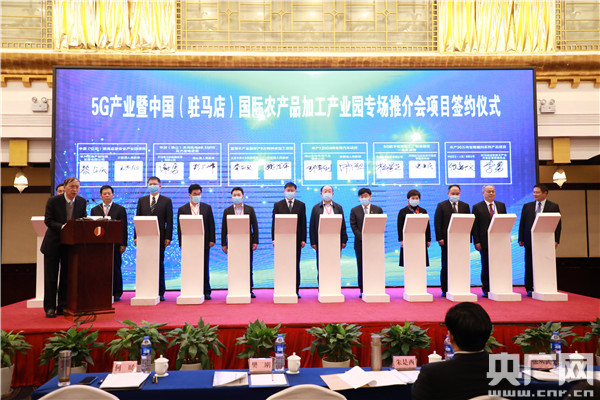 5G產(chǎn)業(yè)暨中國(guó)(駐馬店)國(guó)際農(nóng)產(chǎn)品加工產(chǎn)業(yè)園專場(chǎng)推介會(huì)項(xiàng)目簽約儀式(央廣網(wǎng)記者 汪寧 攝)