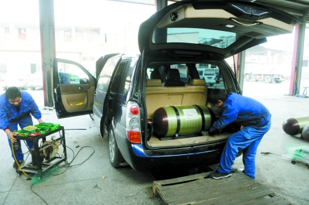 一輛私家車(chē)正在接受油改氣“手術(shù)”