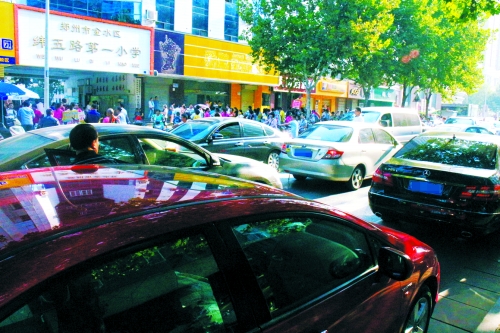 昨天,緯五路一小門口人多、車多堵一起。記者 李康 攝影