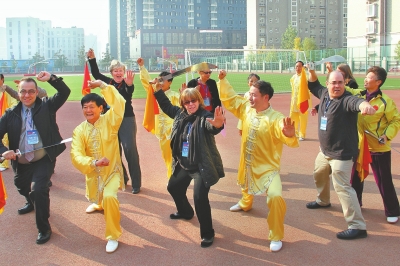 96中的師生們?yōu)槊绹腿朔钌狭斯殴~、葫蘆絲、豫劇、太極拳、毽球、書法、剪紙、茶藝等極具中國韻味和河南特色的精彩表演。許多美國朋友還參與其中,學古箏、秀太極、踢毽球,甚至用起了毛筆。在觀摩了96中的課堂教學情況后,來自紐約州的東西方國際學校校長本·謝爾曼說:“這所學校環(huán)境優(yōu)美,孩子們的英語都很棒!