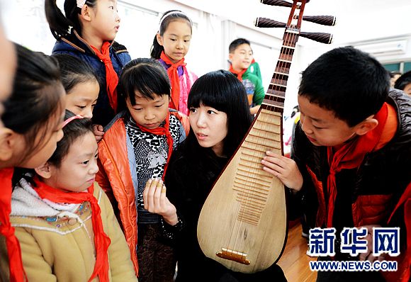11月13日,河南省青年民族樂團琵琶演奏員劉曉萌(右二)給小學(xué)生講解演奏知識。