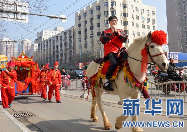 3月9日,新郎騎著白馬走在花轎前面。