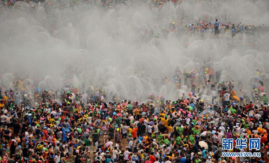 央廣網(wǎng)河南分網(wǎng)消息 據(jù)新華網(wǎng)報(bào)道:4月15日,數(shù)萬(wàn)名當(dāng)?shù)厝罕姾陀慰驮谠颇鲜∥麟p版納州景洪市潑水廣場(chǎng)上潑水狂歡。當(dāng)日是2014年西雙版納潑水節(jié),也是傣歷1376年新年節(jié)系列活動(dòng)的最后一天,數(shù)萬(wàn)名當(dāng)?shù)厝罕姶┥瞎?jié)日盛裝,和外地游客一起在云南省西雙版納傣族自治州景洪市互相潑水,互祝吉祥、幸福、健康。潑水節(jié)是傣族人民送舊迎新的傳統(tǒng)節(jié)日,已有上千年歷史。(新華社記者 藺以光 攝)