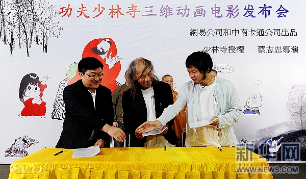 5月4日,臺(tái)灣漫畫(huà)家蔡志忠(中)與出品方代表浙江中南卡通有限公司總經(jīng)理沈玉良(左)、網(wǎng)易副總裁胡志鵬在《功夫少林寺》3D動(dòng)畫(huà)電影發(fā)布會(huì)現(xiàn)場(chǎng)簽約。
