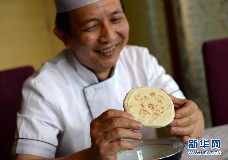 國家級非物質(zhì)文化遺產(chǎn)傳承人、西安同盛祥泡饃大師馬桂軍在展示羊肉泡饃所用的饦饦饃(5月15日攝)。