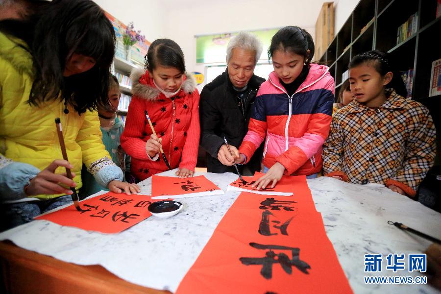 2月2日,在廣西柳州市融安縣沙子鄉(xiāng)石巖屯,退休教師吳壁珍指導(dǎo)孩子們練習(xí)毛筆字。