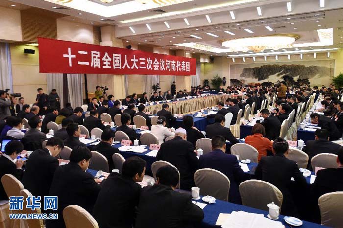 新華網(wǎng)河南頻道3月6日電 3月5日,十二屆全國人大三次會議河南代表團舉行全體會議。 新華社記者李博 攝