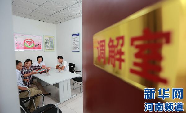 6月30日,在河南省武陟縣原莊“村級群眾工作站”,退休校長張淑珍(左二)在調(diào)解村民因打架產(chǎn)生的矛盾糾紛。