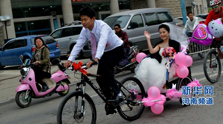 央廣網(wǎng)河南分網(wǎng)消息 10月22日上午,在30多位騎友的祝福聲中,從外地來鄭州工作的新郎祝玉其用自行車當(dāng)作花車,將美麗的新娘趙劉霞迎娶回家。漂亮的新娘、帥氣的新郎、時(shí)尚的自行車隊(duì)穿行在鄭州市區(qū),立刻成為綠城一道最亮麗的風(fēng)景線,沿途市民紛紛駐足拍照,秋日里最溫馨、浪漫的畫面迅速傳遍朋友圈。