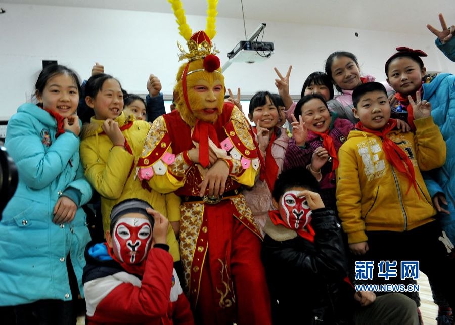 央廣網(wǎng)河南分網(wǎng)消息 3月9日上午,鄭州市文化路第二小學(xué)校迎來了擅長(zhǎng)表演“猴戲”的河南豫劇院演員孫敬鵬,孫老師從孩子們最感興趣“臉譜文化”入手,教學(xué)生畫“猴王”臉譜,表演了“美猴王”孫悟空的動(dòng)作程式,惟妙惟肖的演示,引得孩子們競(jìng)相模仿,課堂仿佛變成了“花果山”,群猴嬉戲、跳躍玩耍,在一招一式的參與和模仿中,孩子們對(duì)我國的戲曲表演文化有了全面、直觀的了解和體驗(yàn)。