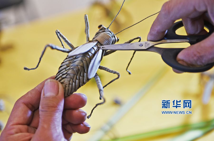 王潤鑫正在編織棕櫚葉昆蟲造型