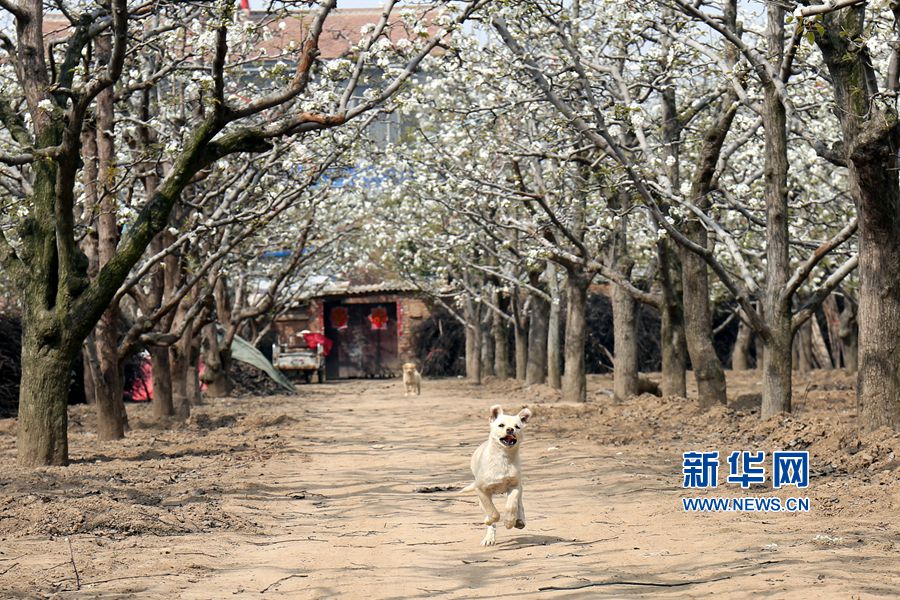 3月30日,一只小狗在梨樹下奔跑。馮磊 攝