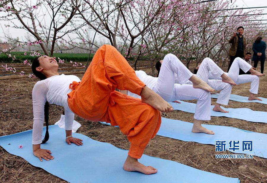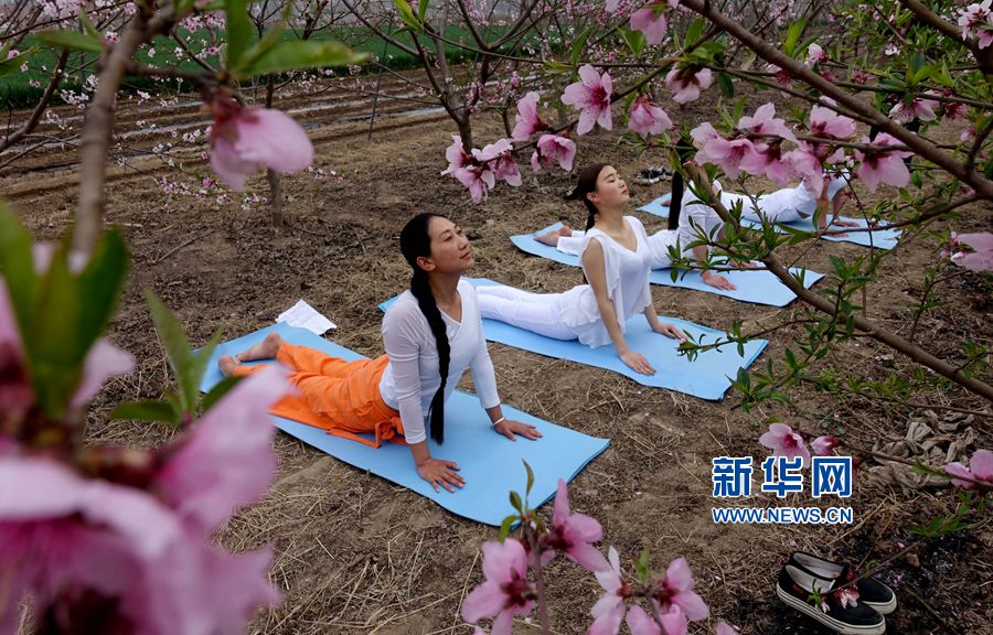 3月30日,河南省夏邑縣瑞麗瑜伽館的學(xué)員在桃花園里練習(xí)瑜伽。