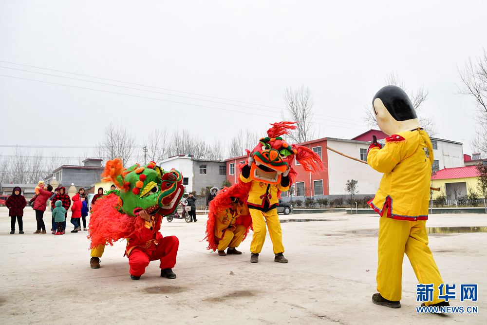 2月7日,村民在羅閣村文化舞臺(tái)表演舞獅。 當(dāng)日,河南省駐馬店市西平縣盆堯鎮(zhèn)羅閣村的文化舞臺(tái)熱鬧非凡,村民表演了舞獅、豬八戒背媳婦、抬轎子、劃旱船、騎竹馬、吹喇叭等民俗節(jié)目,吸引眾多村民前來觀看。新華社記者馮大鵬攝 -