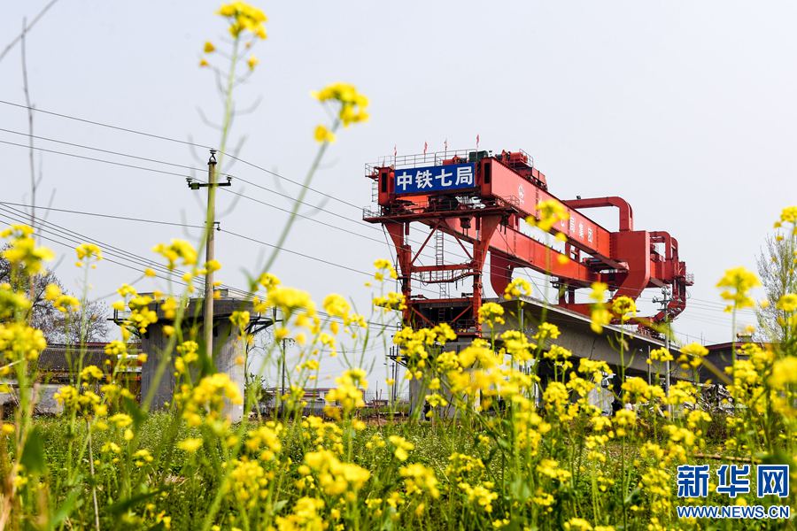 4月6日,中鐵七局鄭州公司的工程人員在鄭萬(wàn)鐵路河南段3標(biāo)段進(jìn)行架梁作業(yè)。