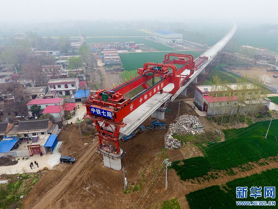 4月6日,中鐵七局鄭州公司的工程人員在鄭萬(wàn)鐵路河南段3標(biāo)段進(jìn)行架梁作業(yè)。 -
