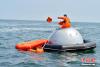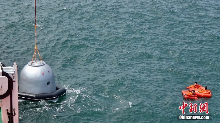 16名中國航天員和2名歐洲航天員,8月21日在山東省煙臺市附近海域圓滿完成了海上救生訓練任務。圖為布放在后甲板上的神舟飛船模擬返回艙。海上救生訓練設置理論培訓、單項操作訓練和綜合訓練三個部分,這是中國航天員首次在真實海域開展救生訓練。 中新社記者 張素 攝 -